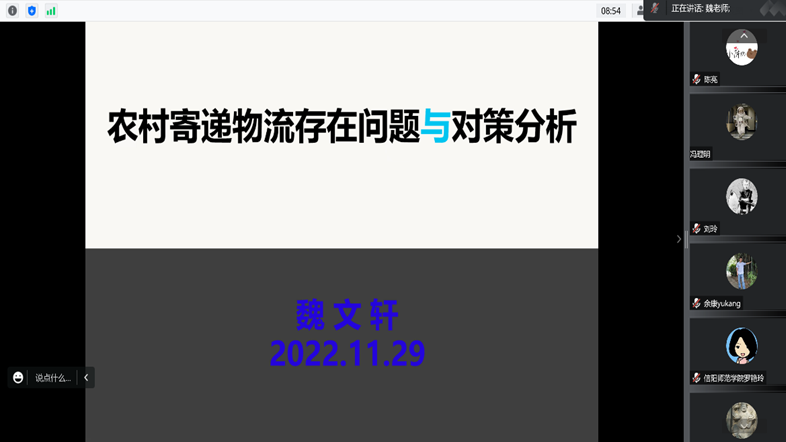 11月29日下午,tyc41183太阳成集团第五期“景明论坛”在腾讯会议平台成功举办。tyc41183太阳成集团魏文轩教授作了题为“农村寄递物流存在问题与对策分析”的学术报告,tyc41183太阳成集团部分师生聆听了报告。