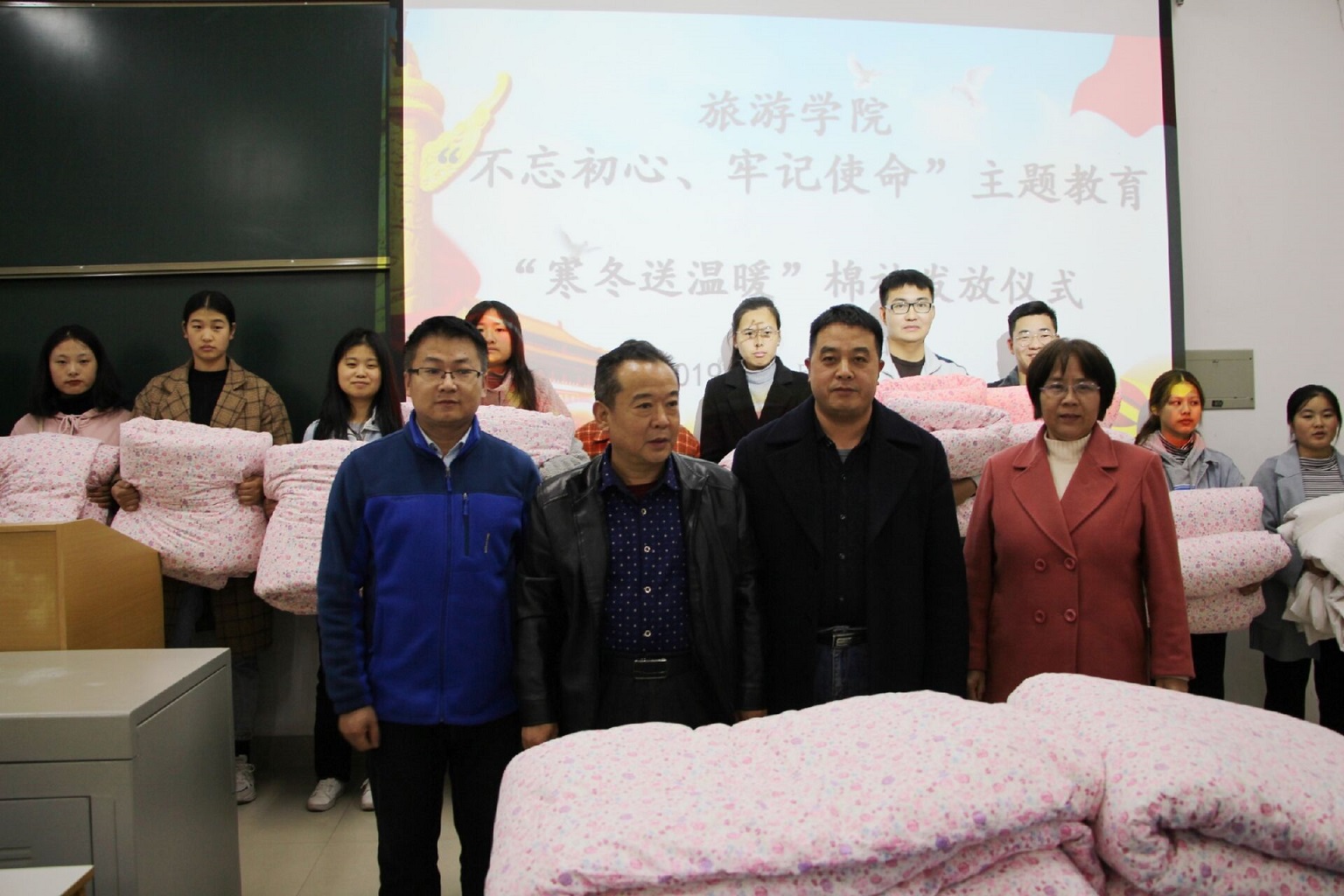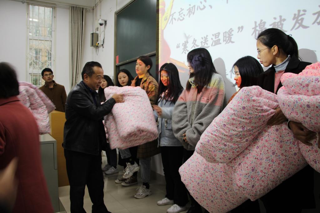 爱心助未来,棉被暖寒冬。11月19日下午,tyc41183太阳成集团于经管楼106进行“寒冬送温暖”活动。tyc41183太阳成集团党委书记曹明贵、党委副书记张晓峰等领导老师参加此次发放仪式。仪式由团委书记张庆敏主持。
