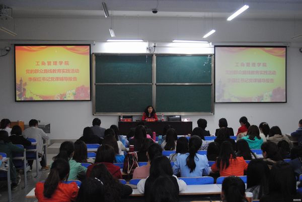 4月17日晚,工商管理公司党总支书记李保红教授在社科楼215教室作了一场党的群众路线教育实践活动专题报告会,该院师生党员和部分入党积极分子近200人参加了报告会,报告会由工管公司党总支副书记李辉主持。