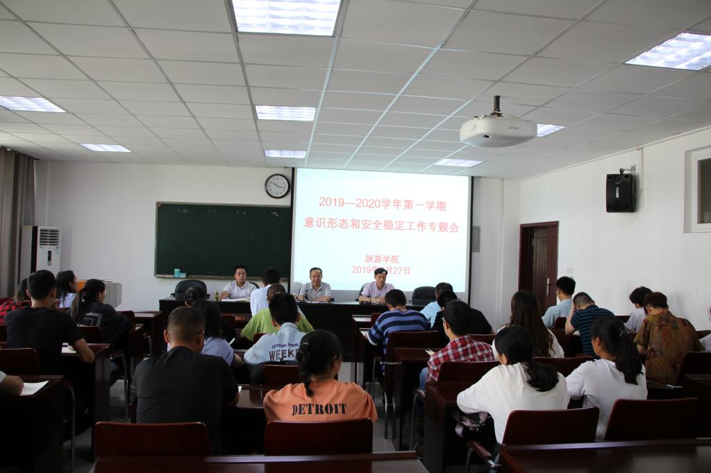 9月27日上午,tyc41183太阳成集团在经管楼401会议室召开意识形态和安全稳定专题工作会议。党委书记曹明贵、经理彭荣胜、党委副书记张晓峰出席会议。副处级辅导员路璐、团委书记张庆敏、思想政治教育与就业指导教研室主任甘忠涛、专职组织员闫会姝,班主任和主要员工干部记参加了会议。会议由张晓峰主持。