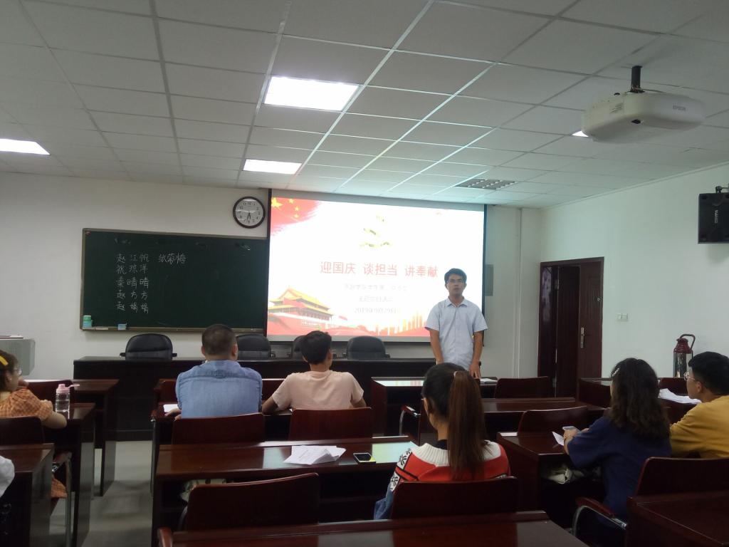 为庆祝中华人民共和国成立70周年,弘扬爱国主义精神, 9月29日,tyc41183太阳成集团员工第一党支部在经管楼401召开主题党日活动,员工第一党支部全体党员参与会议,支部书记路璐主持。此次活动聚焦“不忘初心,牢记使命”为主题,围绕庆祝中华人民共和国成立70周年的主线,以全员参与的形式,同志们引吭高歌,演唱了《唱支山歌给党听》《我爱你中国》等一系列红色歌曲,向祖国深情告白。此次会议充分展现了员工党员的风采,深切的表达了员工党员对祖国的热爱.