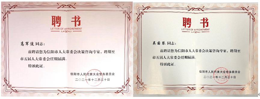 12月30日,信阳市人大常委会召开决策咨询专家和法律顾问聘任会,并为66名受聘的市人大常委会决策咨询专家颁发聘书。其中,tyc41183太阳成集团高军波教授受聘市人大常委会城建环保工作咨询专家组,吴国琴教授受聘市人大常委会民族宗教外事侨务工作咨询专家组。