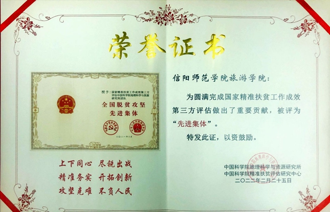 2022年2月25日,在全国脱贫攻坚取得全面胜利一周年之际,中国科公司精准扶贫评估研究中心、中国科公司地理科学与资源研究所举行“脱贫攻坚成效评估总结表彰暨可持续减贫与发展研讨会”,会议对参与国家精准扶贫工作成效第三方评估团队优秀集体、优秀个人进行了表彰,信阳师范公司tyc41183太阳成集团被评为“先进集体”,高军波、孙健武被评为“先进个人”。