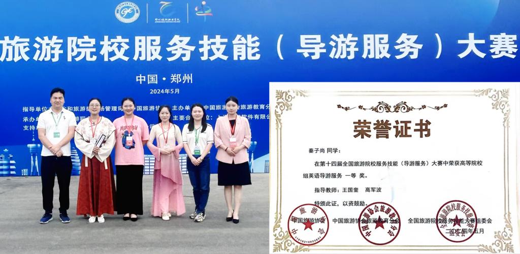 5月26日,第十四届全国旅游院校服务技能(导游服务)大赛在郑州落下帷幕。经过理论考试、导游讲解、才艺展示三个环节的激烈角逐,2022级旅游管理1班秦子尚、2023级旅游管理2班吴思妤分别获得高等院校组英语导游服务一、三等奖,2022级旅游管理2班张文慧、2022级旅游管理1班党欣雨分别获得高等院校组普通话导游服务二、三等奖。