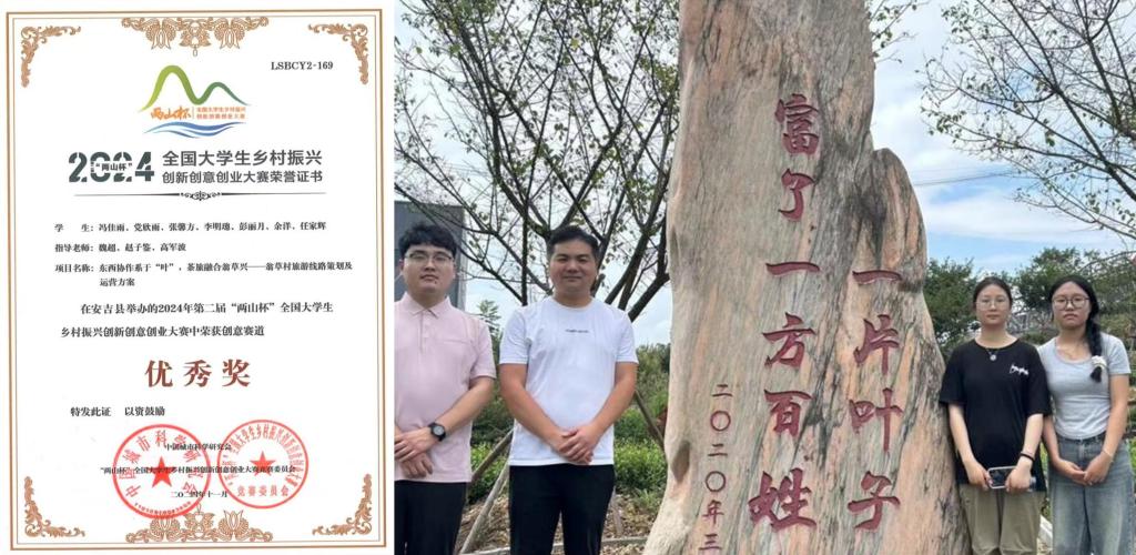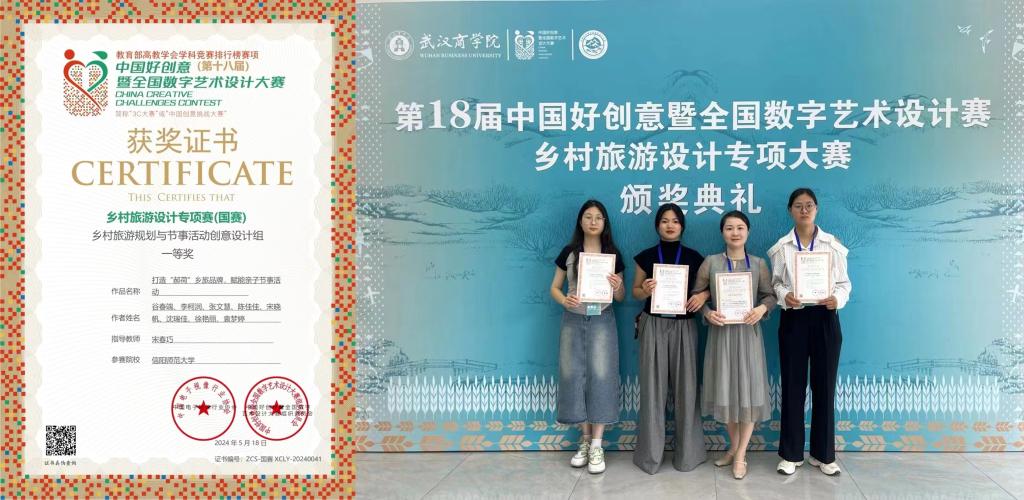 5月18日,由中国好创意暨全国数字艺术设计大赛组委会主办、武汉商公司承办的第十八届中国好创意乡村旅游设计专项赛颁奖典礼在武汉隆重举行。公司李柯润团队(李柯润、谷春端、张文慧、陈佳佳)作品“打造郝荷乡旅品牌,赋能亲子节事活动”荣获决赛一等奖,张馨方团队(张馨方、王国旗、张圣坤、王嘉哲)作品“信阳环南湾湖茶旅游线路”荣获决赛三等奖。