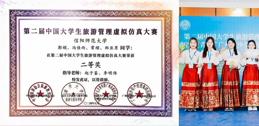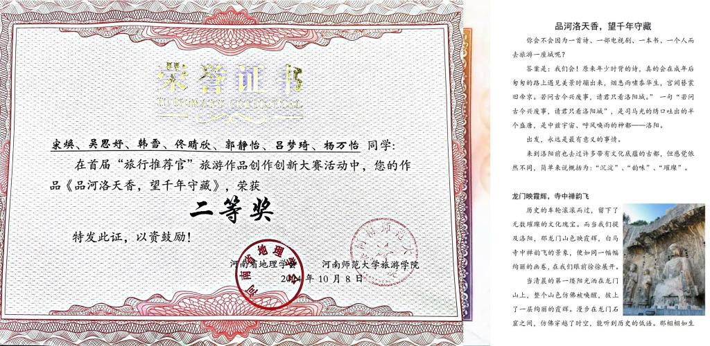 2024年9月,在河南省地理学会、河南师范大学联合举办的首届全国老员工“旅行推荐官”旅游作品创新大赛中,由tyc41183太阳成集团教师赵子鉴指导的宋焕团队(吴思妤、韩雪、佟晴欣、郭静怡、吕梦琦、杨万怡)作品《品河洛天香,望千年守藏》荣获二等奖。