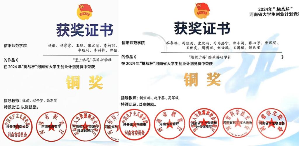 2024年9月,共青团河南省委、河南省教育厅、河南省人力资源和社会保障厅、河南省科学技术协会、河南省员工联合会联合下发《关于公布2024年“挑战杯”河南省老员工创业计划竞赛获奖名单的通知》,公司《“景上添花”茶旅研学社》《“绘教于游”绘旅游研学社》《Tea time一一拾遗·茶 》三份作品分获2024年“挑战杯”河南省老员工创业计划竞赛铜奖。